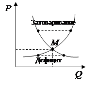 Кривые спроса и предложения пересекаются в точке М, которую называют точкой равновесия, а цену, при которой возникает рыночное равновесие – равновесной ценой.