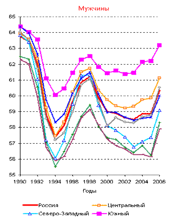 Продолжительность жизни при рождении в федеральных округах в 1990-2006 годах (лет)