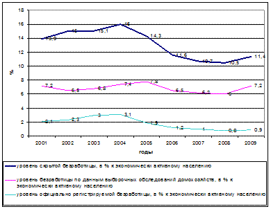 Как показано на рисунке, уровень официально регистрируемой безработицы в республике в 2009 году составил 0,9% экономически активного населения и сократился за последние 5 лет более чем в 3 раза [14, с. 44]. Вместе с тем, уровень незарегистрированной безработицы в 2009 году составил 7,2%, а уровень скрытой безработицы за этот период, согласно расчетам, составил 11,4% от экономически активного населения и превысил официальный показатель за аналогичный период в несколько раз [14, с. 44].