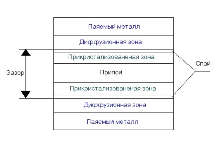Паяное соединение неоднородно по строению и составу. Паяный шов включают в себя спаи, диффузионные зоны и место припоя кристаллизовавшегося в зазоре между деталями с прикристаллизованными ионами.