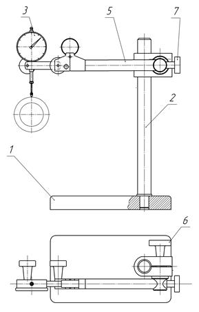 Данное контрольное приспособление служит для контроля радиального и торцевого биения цилиндрической детали. На основании 1 установлен штатив, состоящий из оправок 2, 5 и кронштейна 4. На оправке 5 ,закреплен индикатор часового типа 3, чувствительный элемент которого касается измеряемой поверхности детали. Деталь в свою очередь установлена в центрах станка. С помощью винтов 6 и 7 можно отрегулировать положение в пространстве индикатора 3 относительно детали.