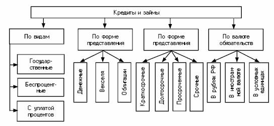Рисунок 1. Классификация кредитов и займов в соответствии с законодательными актами по бухгалтерскому учету