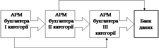 3) мережі АРМ бухгалтерів із управлінням розподіленою базою даних (рис.2).