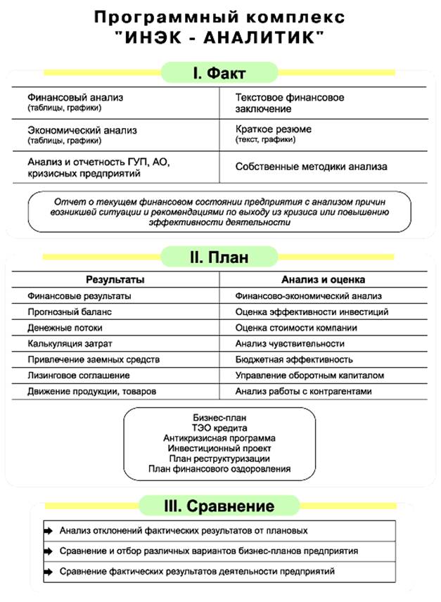 Программный комплекс "ИНЭК-Аналитик", полностью включая возможности программ "ИНЭК-АФСП" и "ИНЭК-АДП", дополнительно позволяет выполнить весь комплекс работ по планированию деятельности предприятий: финансово-экономический анализ; разработка бизнес-плана; анализ бизнес-плана; анализ эффективности инвестиций; работа с контрагентами; оценка стоимости бизнеса; анализ чувствительности; бюджетная эффективность; план-фактный контроль; консолидация; сравнение и мониторинг (Приложение 3).
