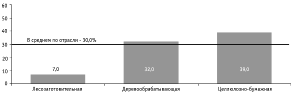 Общее число предприятий, функционирующих в сфере лесозаготовки и переработки древесины, превышает 20 тысяч, причем среди них преобладают сравнительно мелкие компании. Это обстоятельство определяет весьма низкий для российской промышленности уровень концентрации производства. В среднем по отрасли доля четырех крупнейших производителей составляла около 30%, что является одним из самых низких показателей в отечественной промышленности (в среднем по России - более 50%). При этом в сфере лесозаготовки удельный вес ведущих продуцентов не превышает 7% (рис. 1.1.1).