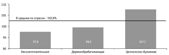 В 2001 г. объем выпуска продукции на основе древесины увеличился всего на 2,6%, отставая от динамики производства промышленной продукции в целом. По результатам года лесной комплекс входил в тройку наименее динамичных отраслей отечественной индустрии.