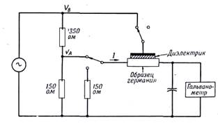 В /см. Между концами образца германия было приложено меньшее напряжение той же частоты и фазы. В результате модуляции этого напряжения при изменениях проводимости, вызываемых эффектом поля, в цепи гальванометра индуцируется постоянный ток, который, пропорционален эффекту поля.