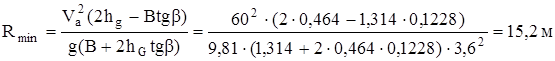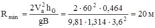 Если движение происходит на горизонтальной дороге, то β=0, тогда минимальный радиус поворота находится: