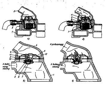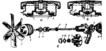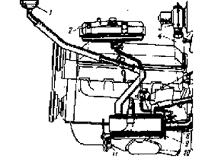 Система охлаждения двигателя обычно используется для подогрева впускного трубопровода, охлаждения компрессора 3 и отопления кабины или пассажирского помещения кузова. Отопительная система состоит из радиатора 9, вентилятора, воздухораспределительных труб и рукояток управления.