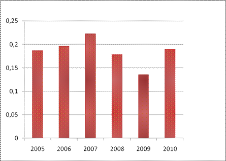 Після стрімкого падіння ринку в 2008-2009 роках минулий рік показав більш позитивні результати. Кажуть про позитивну тенденцію і дані Держкомстату України - вже осіння зводка зафіксувала приріст. Так, виробництво елементів конструкцій збірних для будівництва (ЗБВ і ЗБК) у жовтні 2010 року збільшилося на 9,0% до рівня жовтня 2009 року і склало 0,190 млн м3; в січні-жовтні збільшилося на 4,7% до відповідного періоду 2009 року, склавши 1,4 млн м3. Залишки готової продукції на складах заводів-виготовлювачів на кінець жовтня - близько 0,2 млн м3. На рис. 1.1 зображено обсяг виробництва ЗБВ на ринку України.