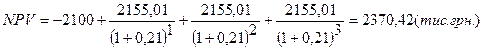 Розрахункові дані свідчать, що чистий дисконтований дохід проекту складає 2370,42 тис. грн. Витрати проекту окуплюються за 1 рік і 5 місяців, індекс доходності капіталовкладень складає 2,12 грн./грн. Отже, проект рекомендовано до здійснення.