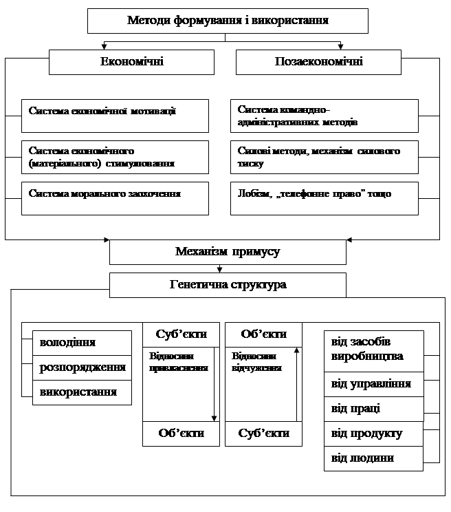 Рис. 1.1 Генетика відносин власності (методи, механізм, структура) [5, c.64]