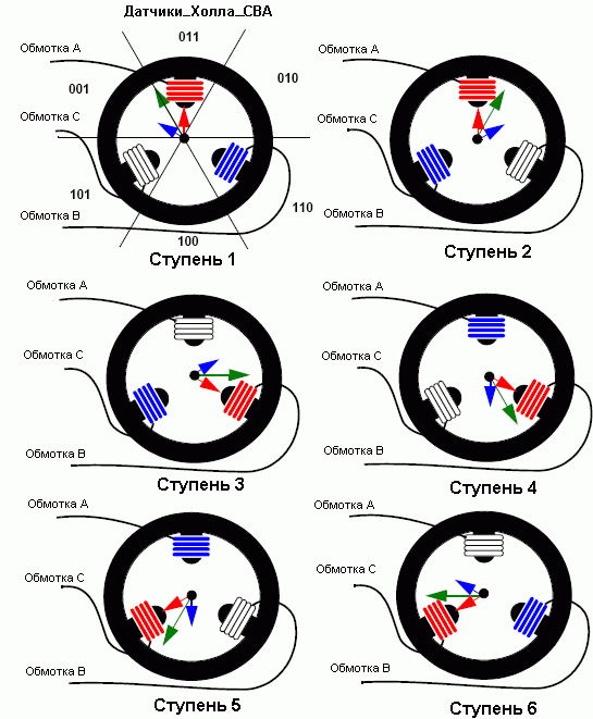 Если следовать схеме коммутации, показанной на рисунке 3 и в таблице 1, то получим шесть различных векторов магнитного потока, соответствующих шести ступеням коммутации. Шесть ступеней соответствуют одному обороту ротора.