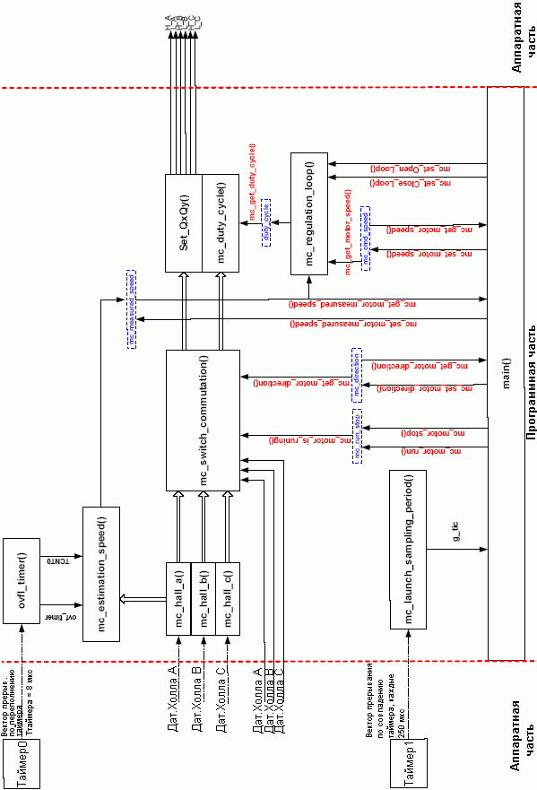 Данные функции выполняются, если выявлено внешнее прерывание (изменение выхода датчиков Холла). Они позволяют выполнить коммутацию фаз и вычислить скорость.