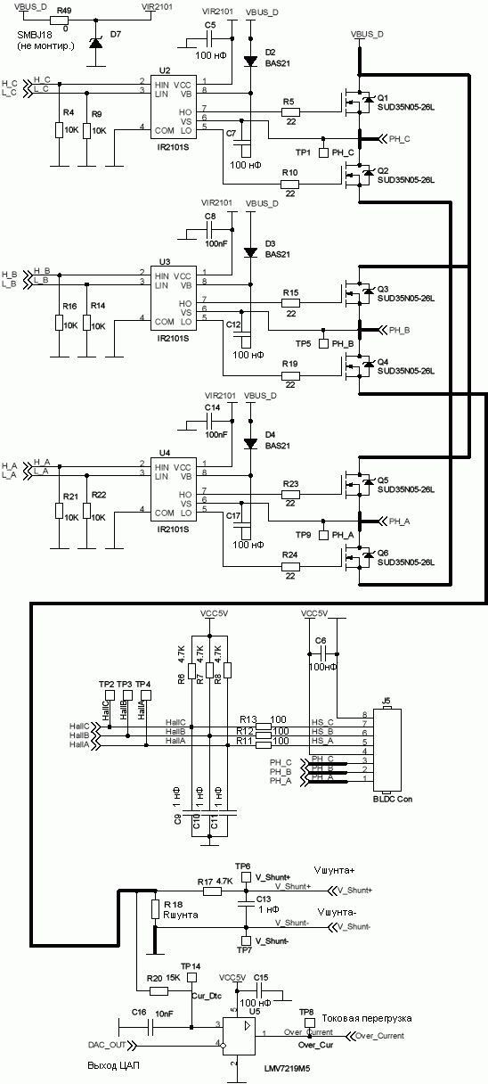 Для управления БКЭПТ используется силовой каскад, состоящих из 3 полумостов. Схема силового каскада показана на рисунке 4.