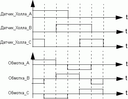 Коммутация фаз зависит от состояния датчиков Холла.