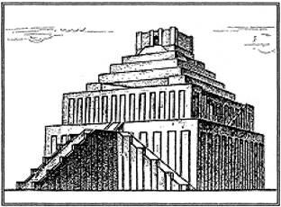 — высокая башня из кирпича, опоясанная выступающими террасами и создающая впечатление нескольких башен, которые уменьшались в объеме уступ за уступом. Таких уступов-террас могло быть от 4 до 7. Зиккураты были раскрашены, причем нижние уступы более темные, чем верхние; террасы были, как правило, озеленены. Верхняя башня зиккурата нередко была увенчана золотым куполом. В ней находилось святилище бога, его «жилище», где, как полагали шумеры, бог гостил по ночам. Внутри этой башни не было ничего, кроме ложа и золоченого стола. Впрочем, эту башню использовали и для более конкретных и земных нужд: жрецы вели оттуда астрономические наблюдения.