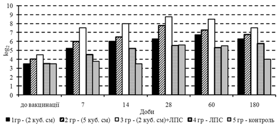 порівняно з введенням однієї вакцини. Після другого введення цих препаратів титр антитіл стабілізувався на рівні 6,4–8,0 log2