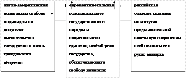 . Традиции сильного государства, которые отсутствовали в США и островной Великобритании, сформировали особый режим отношений государства и гражданского общества, который нашел свое отражение в концепции правового государства. Наиболее активно она разрабатывалась в Германии. Акцент в ней был сделан на идее об особой роли государства в жизни общества. Свобода индивида ставилась в зависимость от мощи государства, поскольку, лишь будучи сильным, государство способно гарантировать защиту прав человека, его индивидуальную свободу, порядок в обществе. В этом случае идея государственного порядка, национального единства ставилась выше ценности свободы личности.