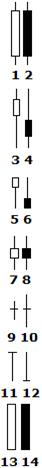 Существует множество различных видов свечей, справа изображены самые простые из них. Ниже приведены названия и вероятные