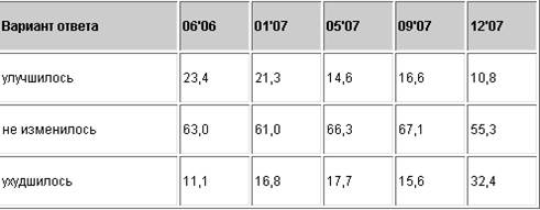 Из таблицы видно, что большинство опрошенных не ощущают улучшений в своем материальном положении, а треть опрошенных, что достаточно много, считают, что их положение ухудшилось.