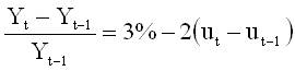 3% - темп роста потенциального ВНП, обусловленный: а) ростом численности населения, б) ростом капиталовооруженности и в) научно-техническим прогрессом; 2 – это коэффициент, показывающий на сколько процентов сокращается фактический ВВП при росте уровня безработицы на 1 процентный пункт (это означает, что если уровень безработицы увеличивается на 1 процентный пункт, фактический ВВП сокращается на 2%). Этот коэффициент был рассчитан Оукеном на основе анализа эмпирических (статистических) данных для американской экономики, поэтому для других стран он может быть иным.[15,16 ]