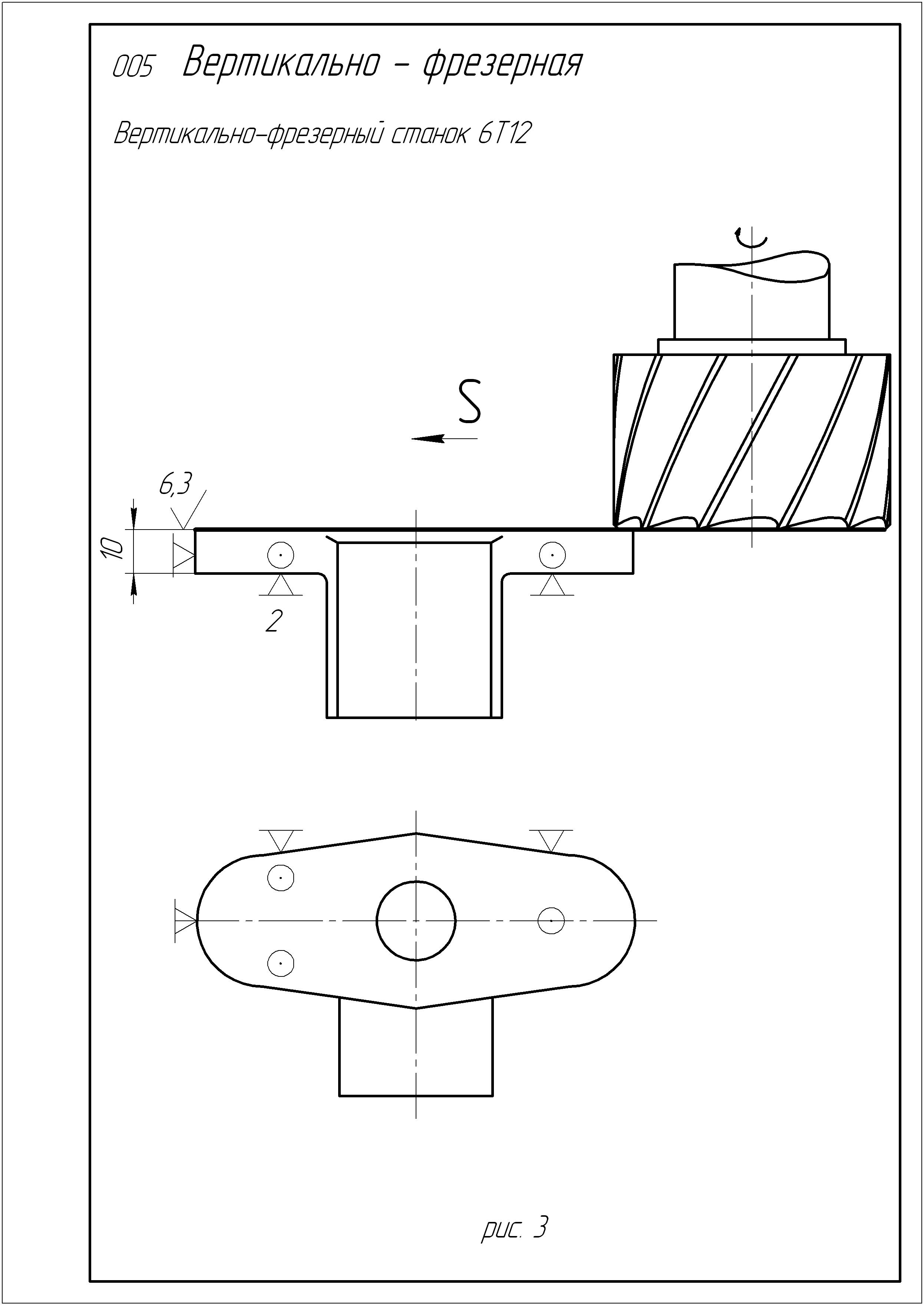 Операция 005 Вертикально-фрезерная Оборудование: Вертикально-фрезерный станок 6Т12 (N=7,5 кВт, η=0,8) Инструмент: Торцевая насадная фреза из быстрорежущей стали Р6М5 63 с числом зубьев Z=8 по ГОСТ 9304-69. (Фреза 2210-0081 ГОСТ 9304-69). Первый технологический переход - подготовка технических баз, т. е. фрезерование поверхности А. Шероховатость этой поверхности Ra=6,3 мкм, что позволяет обработать её за один технологический переход (рис.3).
