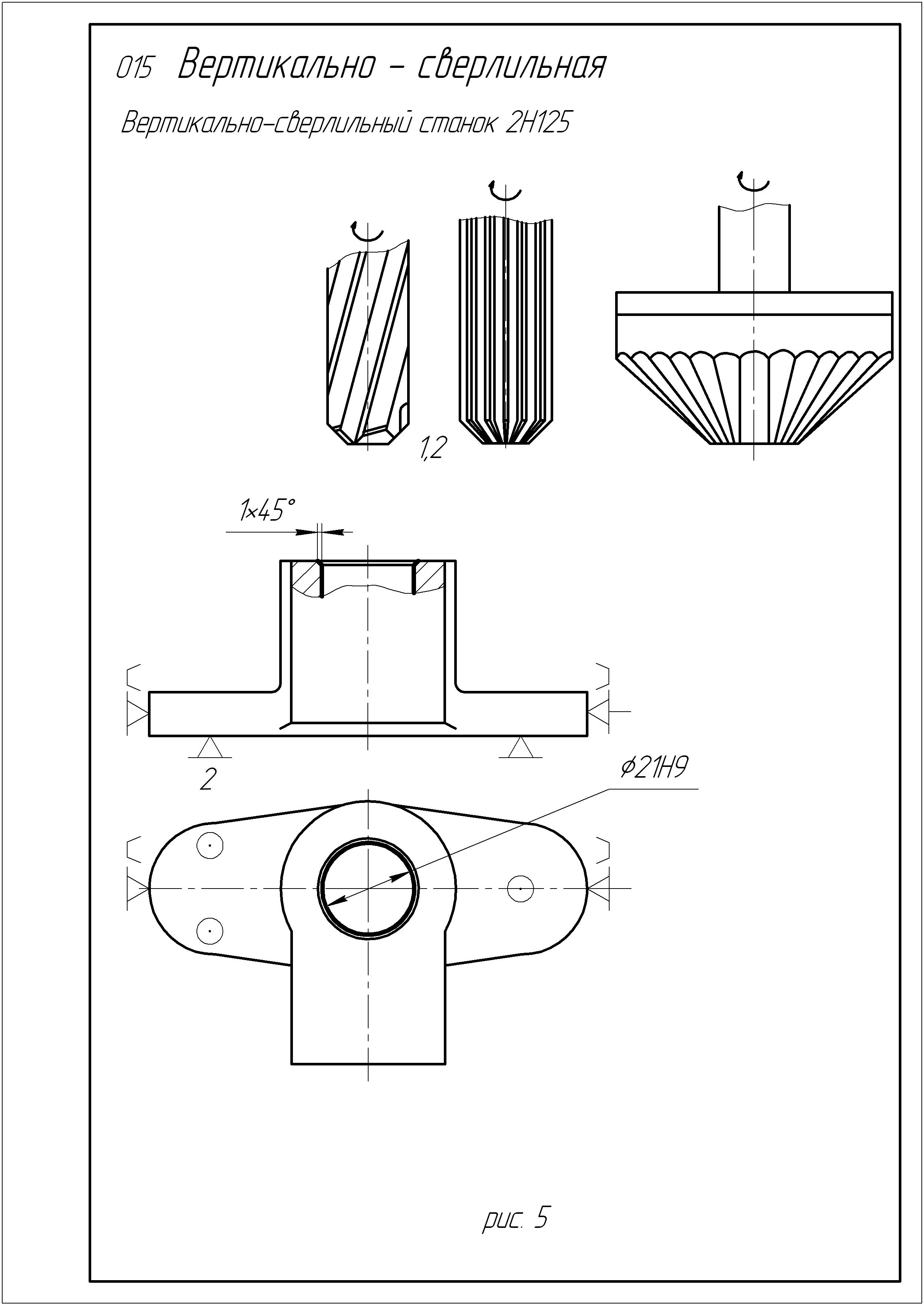 Операция 015 Вертикально-сверлильная Оборудование: Вертикально-сверлильный станок 2Н125 (N=2,8кВт, η=0,8) Инструмент: Цельный зенкер с коническим хвостиком 20 с числом зубьев Z=4 по ГОСТ 12489-71, цельный зенкер с коническим хвостиком 20,72 с числом зубьев Z=4 по ГОСТ 12489-71, машинная цельная развёртка с коническим хвостиком 21 с числом зубьев Z=8 по ГОСТ-1672-80, цилиндрическая зенковка с коническим хвостиком 21. Материал инструментов быстрорежущая сталь Р6М5. Технологические переходы - черновое и чистовое зенкерование внутреннего сквозного отверстия сначала на 20, затем на 20,72, затем развёртывание отверстия на 21Н9 и зенкование фаски 1х45(рис.5).