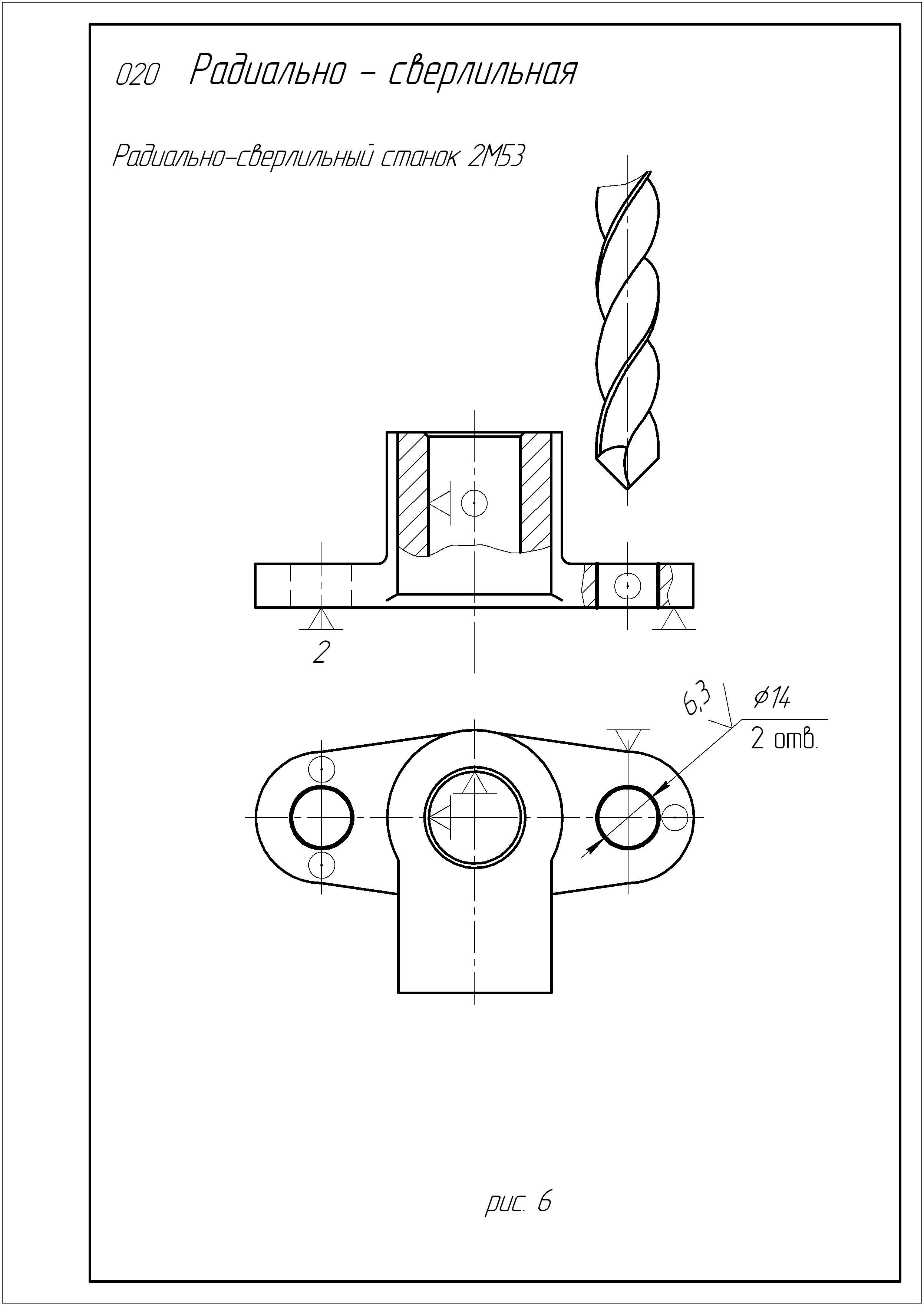 Операция 020 Радиально-сверлильная Оборудование: Радиально-сверлильный станок 2М53 (N=4,5 кВт, η=0,8) Инструмент: Два спиральных сверла с коническим хвостиком 14 мм. по ГОСТ 2092-77 (Сверло 2301-0416 ГОСТ 2092-77). Материал сверла Р6М5. Сверлим два сквозных отверстия (рис.6)