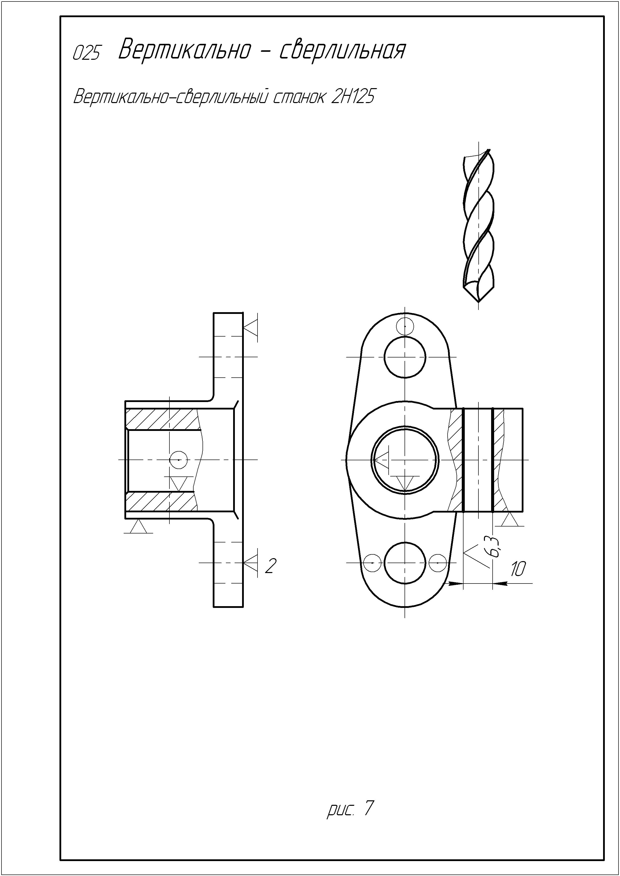 Операция 025 Вертикально-сверлильная Оборудование: Вертикально-сверлильный станок 2Н125 (N=2,8кВт, η=0,8) Инструмент: Спиральное сверло с цилиндрическим хвостиком 10 мм. по ГОСТ 886-77 (Сверло 2300-7016 ГОСТ 886-77). Материал сверла Р6М5. Сверлим сквозное отверстие (рис.7).