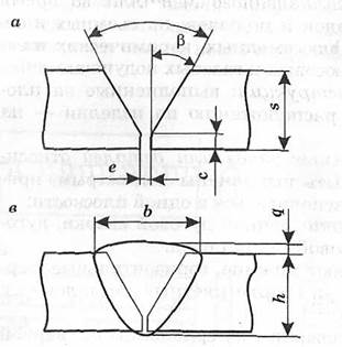 Рис. 4 . Стыковое сварное соединение: а — подготовка под сварку; б — элементы сварного соединения;