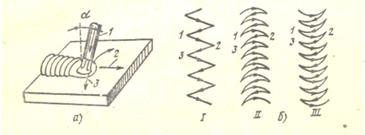 Узкий валик накладывают при проваре корня шва, сварке тонких, листов, сварке горизонтальных и потолочных швов (независимо от числа слоев). Чем медленнее сварщик перемещает электрод вдоль шва, тем шире получается валик. В узком, но высоком валике объем наплавленного металла невелик, такой валик застывает быстрее, и растворенные в металле не выделившиеся газы могут вызвать пористость шва. Поэтому чаще применяют уширенные валики, которые также менее склонны к образованию кристаллизационных трещин. При выполнении их сварщик сообщает электроду колебательные движения поперек шва, причем конец электрода должен совершать три движения (Рис.6, а): поступательное 1 вдоль оси электрода сверху вниз, поступательное 2 вдоль линии шва и колебательное 3 поперек шва, перпендикулярно его оси. Колебательные движения электрода способствуют прогреву кромок и замедляют остывание сварочной ванны.