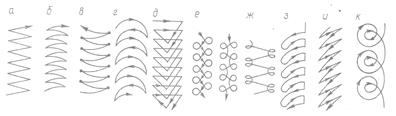 Рис. 7. Основные виды траекторий поперечных движений конца электрода при слабом (а, б), усиленном (в – ж) прогреве свариваемых кромок, усиленном прогреве одной кромки (з, и), прогреве корня шва (к)