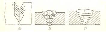 Соединения встык с V-образной подготовкой кромок в зависимости от толщины металла сваривают однослойными или многослойными швами. При сварке в один слой дугу возбуждают в точке а
