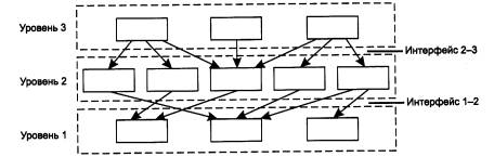 При декомпозиции часто используют многоуровневый подход. Он заключается в следующем. Все множество модулей разбивают на уровни. Уровни образуют иерархию, то есть имеются вышележащие и нижележащие уровни (рис. 1.21). Множество модулей, составляющих каждый уровень, сформировано таким образом, что для выполнения своих задач они обращаются с запросами только к модулям непосредственно примыкающего нижележащего уровня. С другой стороны, результаты работы всех модулей, принадлежащих некоторому уровню, могут быть переданы только модулям соседнего вышележащего уровня. Такая иерархическая декомпозиция задачи предполагает четкое определение функции каждого уровня и интерфейсов между уровнями. Интерфейс определяет набор функций, которые нижележащий уровень предоставляет вышележащему. В результате иерархической декомпозиции достигается относительная независимость уровней, а значит, и возможность их легкой замены.