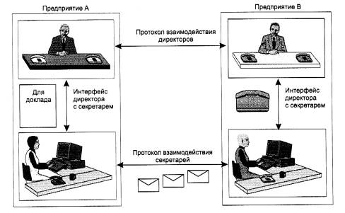 Чтобы еще раз пояснить понятия «протокол» и «интерфейс», рассмотрим пример, не имеющий отношения к вычислительным сетям, а именно обсудим взаимодействие двух предприятий А и В; связанных между собой деловым сотрудничеством. Между предприятиями существуют многочисленные договоренности и соглашения, такие, например, как регулярные поставки продукции одного предприятия другому. В соответствии с этой договоренностью начальник отдела продаж предприятия А регулярно в начале каждого месяца посылает официальное сообщение начальнику отдела закупок предприятия В о том, сколько и какого товара может быть поставлено в этом месяце. В ответ на это сообщение начальник отдела закупок предприятия В посылает в ответ заявку установленного образца на требуемое количество продукции. Возможно, процедура взаимодействия этих начальников включает дополнительные согласования, в любом случае существует установленный порядок взаимодействия, который можно считать «протоколом уровня начальников». Начальники посылают свои сообщения и заявки через своих секретарей. Порядок взаимодействия начальника и секретаря соответствует понятию межуровневого интерфейса «начальник - секретарь». На предприятии А обмен документами между начальником и секретарем идет через специальную папку, а на предприятии В начальник общается с секретарем по факсу. Таким образом, интерфейсы «начальник - секретарь» на этих двух предприятиях отличаются.