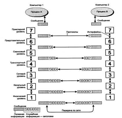 Многоуровневое представление средств сетевого взаимодействия имеет свою специфику, связанную с тем, что в процессе обмена сообщениями участвуют две машины, то есть в данном случае необходимо организовать согласованную работу двух «иерархий». При передаче сообщений оба участника сетевого обмена должны принять множество соглашений. Например, они должны согласовать уровни и форму электрических сигналов, способ определения длины сообщений, договориться о методах контроля достоверности и т. п. Другими словами, соглашения должны быть приняты для всех уровней, начиная от самого низкого - уровня передачи битов - до самого высокого, реализующего сервис для пользователей сети.