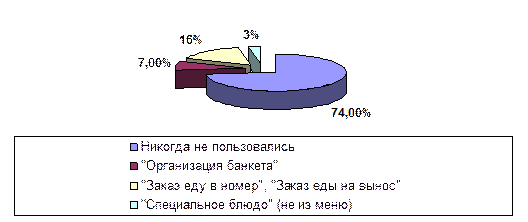 Для анализа процесса принятия решения потребителя о покупке в анкете также были представлены вопросы о дополнительных услугах, предлагаемых ресторанами. Как показало исследование, 74% опрошенных посетителей никогда не пользовались такими услугами. Остальные же 26% распределилась следующим образом.