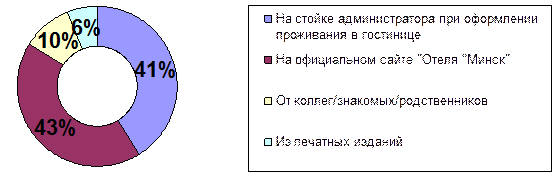 Как показывает рис. 5, наиболее распространенным средством рекламы являются ресурсы Интернет: 43% респондентов ознакомились с предоставляемыми отелем услугами питания на официальном сайте «Отеля «Минск». Это объясняется мощными ресурсами Интернет, используемыми в надлежащей степени гостиницей, а также все возрастающим числом пользователей сети. Однако, практически столько же (41%) узнали о ресторане на стойке администрации при оформлении проживания в гостинице. Это говорит о том, что, ресторанный комплекс ориентируется как на проживающих в отеле, так и на посетителей «из вне».