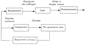 При обміні інформацією завдання відправника й одержувача полягає у тому, щоб скласти повідомлення й використати канал зв'язку для його передачі так, щоб обидві сторони зрозуміли і поділили вихідну ідею. Це зробити важко, тому що кожний етап є одночасно місцем, де її зміст може бути перекручено або повністю втрачено. Етапи процесу комунікацій (зародження ідеї, кодування, вибір каналу, передача, декодування) схематично можна зобразити таким способом (рис. 49). Хоча весь процес комунікацій часто завершується за кілька секунд, що утруднює виділення його етапів, ми проаналізуємо ці етапи, щоб звернути увагу на проблеми, які можуть виникнути в різних його складових.