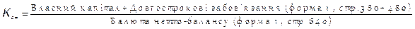 b) Коефіцієнт швидкої ліквідності застосовується для банків –– це відношення грошових коштів, короткострокових фінансових вкладень та короткострокової дебіторської заборгованності до суми короткострокових фінансових зобов’язань (форма №1, стр.210+220+230/стр.620);