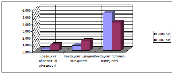 З наведеної таблиці бачимо, що коефіцієнти абсолютної та швидкої ліквідності скоротилися, що пояснюється значним підвищенням короткострокових зобов’язань у 2007 році порівняно з попереднім. Коефіцієнт поточної ліквідності, навпаки, зріс, в перш за все, за рахунок значного скорочення дебіторської заборгованості.