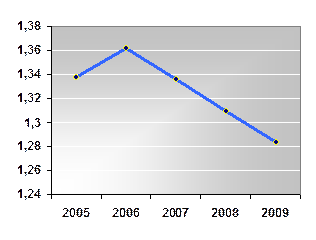 Из таблицы видно, что среднегодовая численность работников в 2009 году уменьшилась на 2% по сравнению с 2005 годом, среднегодовая выработка и стоимость валовой продукции увеличились на 23,19 и 21,08 соответственно.