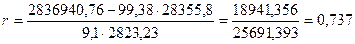 Коэффициент корреляции равен 0,737, что свидетельствует о тесноте связей между факторным и результативным признаками. Положительная корреляция в таких условиях — корреляция, при которой увеличение одной переменной связано с увеличением другой переменной, при этом коэффициент корреляции может быть положительным.