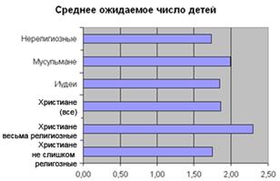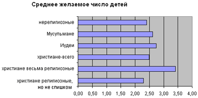 У верующих всех трех религий средние показатели идеального числа детей «Сколько детей лучше всего иметь в семье?», а также желаемого числа детей «Сколько детей Вам хотелось бы иметь при всех необходимых условиях?» несколько выше, чем у нерелигиозных людей (см. диаграмму):