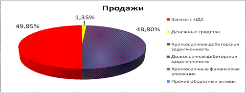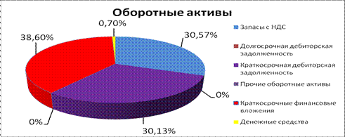 Наибольший удельный вес в составе оборотных активов занимают запасы (49,85%) и дебиторская задолженность (платежи по которой ожидаются в течение 12 месяцев после отчетной даты), составляющая 48,8% оборотных активов. В состав оборотных активов перестали входить краткосрочные финансовые вложения, стоимость которых составляла 167 929 тыс. руб. на начало отчетного периода.