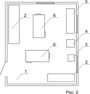 . Примерный проект промышленной зоны мастерской, с расположением необходимого оборудования и инвентаря представлен на рис. 2, где: