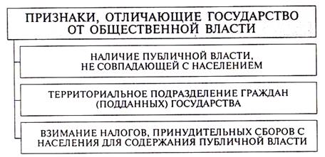 Особенностью государственной власти является и то, что её субъект и объект обычно не совпадают, властвующий и подвластные чаще всего отчётливо разделены. В обществе с классовыми антагонизмами властвующим субъектом выступает экономически господствующий класс, подвластными – отдельные лица, социальные, национальные общности, классы. В демократическом обществе возникает тенденция сближения субъекта и объекта власти, ведущая к их частичному совпадению. Диалектика этого совпадения состоит в том, что каждый гражданин является не только подвластным, но и как член демократического общества он в праве быть индивидуальным источником власти. Он имеет право активно участвовать в формировании выборных (представительных) органов власти, выдвигать и выбирать кандидатуры в эти органы, контролировать их деятельность, быть инициатором их роспуска, реформирования. Право и долг гражданина – участвовать в принятии государственных, региональных и других решений через все виды непосредственной демократии. Словом, при демократическом режиме нет и быть не должно только властвующих и только подвластных. Даже высшие органы государства и высшие должностные лица имеют над собой верховную власть народа, являются одновременно объектом и субъектом власти. Вместе с тем и в демократическом государственно-организованном обществе полного совпадения субъекта и объекта нет. Если демократическое развитие приведёт к такому (полному) совпадению, то государственная власть утратит политический характер, превратится в непосредственно общественную, без органов государства и государственного управления. И опираясь на признаки, отличающие государство от общественной власти (Рис 1.)[3]