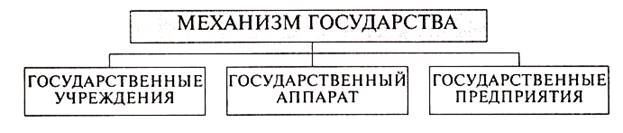 В широком смысле механизм государства включает в себя три составные части: государственные учреждения, государственный аппарат и государственные предприятия