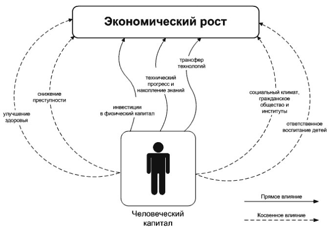 Человеческий капитал лежит в основе многих явлений стимулирующих экономический рост (см. Рисунок 1). Типичные оценки говорят о том, что увеличение человеческого капитала на один процент приводит к ускорению темпов роста душевого ВВП на 1-3%8